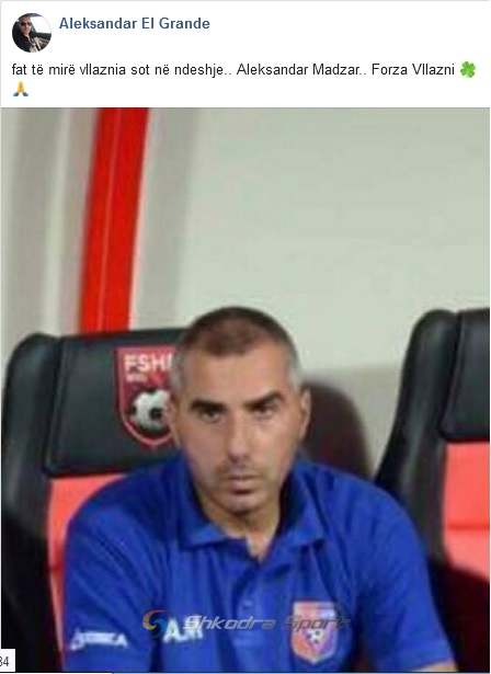 Permes nje statusi te shperndare ne rrjetet sociale, ai shkruan: “Fat te mire sot Vllaznia ne ndeshje. Aleksandar Madzar, Forca Vllaznia”.