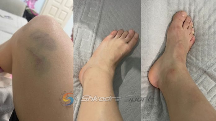 Mjafton të shohim këtë foton ilustruese të këtij shkrimi dhe e kupton qartë atë se çfarë jemi duke thënë. Këto dëmtime të njërës prej lojtareve të Vllaznisë kanë ndodhur në ndeshjen e javës së kaluar ndaj Partizanit. Kanë ardhur si rrjedhojë e tentativave të lojtareve të Partizanit për t’i dëmtuar me çdo kush futbollistet shkodrane.