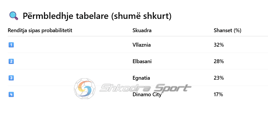 Në përfundim të tyre, më shumë shanse për t’u shpallu kampion sipas CHATGTP ka Vllaznia, plot 32 % e pas saj vjen Elbasani me 28 %. Egnatia është e treta me 23 % dhe Dinamo e katërta me vetëm 17 %. Të ketë të drejtë CHATGTP me këtë parashikim? Kjo duheet parë në të ardhmen…