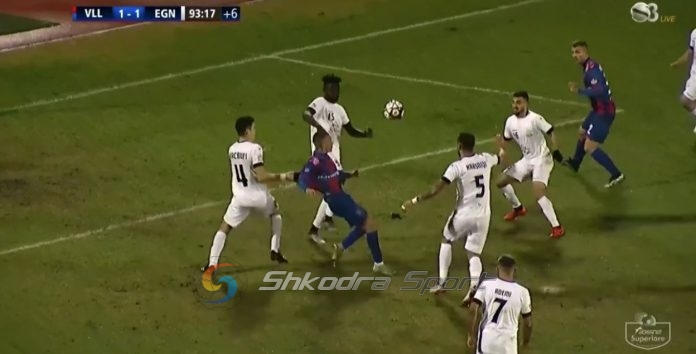 MINUTA 90+3 – Çoba në tentativë për të goditur topin në zonë me një gjysmëkthesë, bie në fushë. Shkak u bë tërheqja nga bluza që i bëri mbrojtësi Kacbufi.