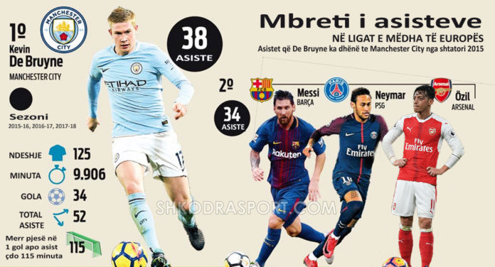 Asnjë nga pesë ligat më të rëndësishme në Europë nuk ka marrë pjesë më shumë sesa ai në këtë pjesë të lojës së futbollit, që kur është te blutë. De Bruyne është aktualisht asistenti më i mirë në Premier League, me 11 të tilla, i ndjekur nga bashkëlojtari i skuadrës së tij, Sané, me 10 asiste.