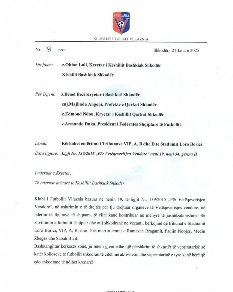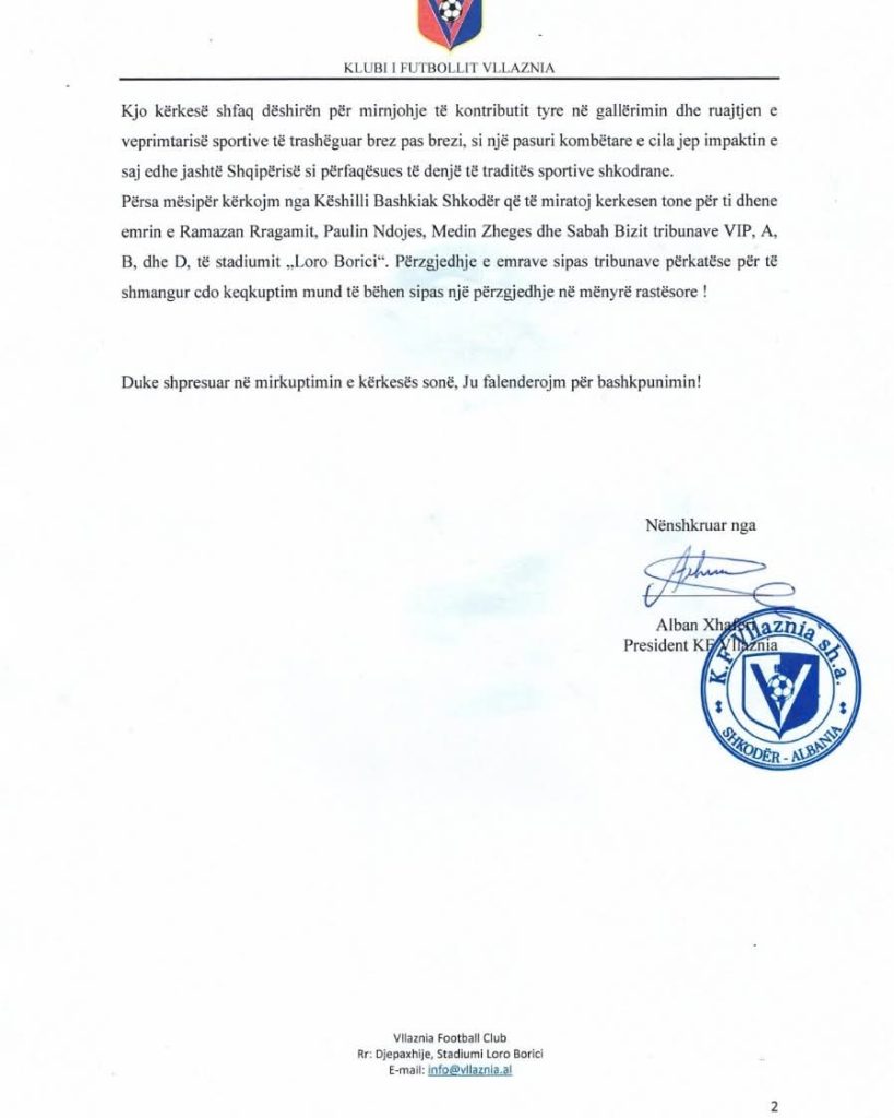Në prag të 107-vjetorit të bashkimit në Vllazni të të gjitha zemrave që rrahin kuq e blu, presim reagimin institucional dhe formalizimin përfundimtar të kësaj kërkese, në nderim të figurave që kanë ndërtuar historinë e futbollit shkodran.